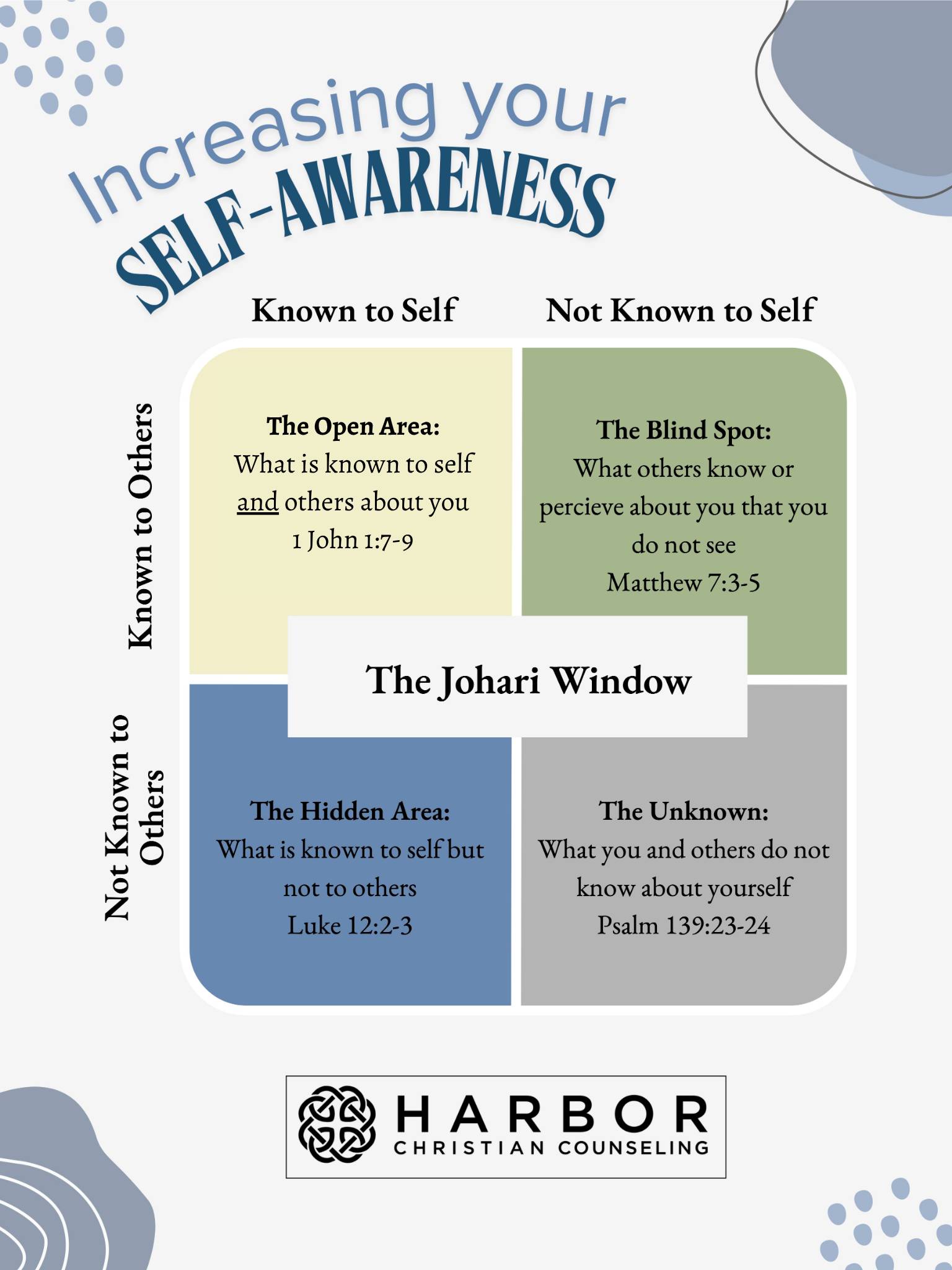 Finally, the last quadrant of the window—the Unknown—is where we can invite the God who created us to fill in the picture. The process of discovering who we are in Christ and how God has uniquely fashioned us is a lifelong journey. There may be much we don’t see, but Jesus is in the business of restoring sight.