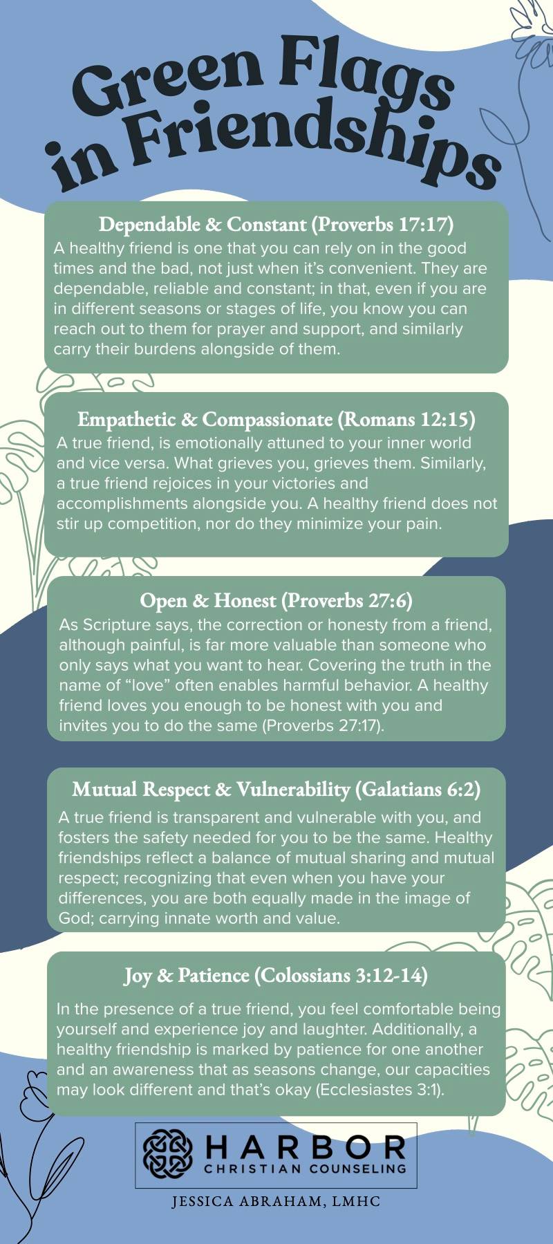 Check out the infographic below to better understand some “green flags” to look out for in your friendships and reflect on as you consider the type of friend you want to be to others: